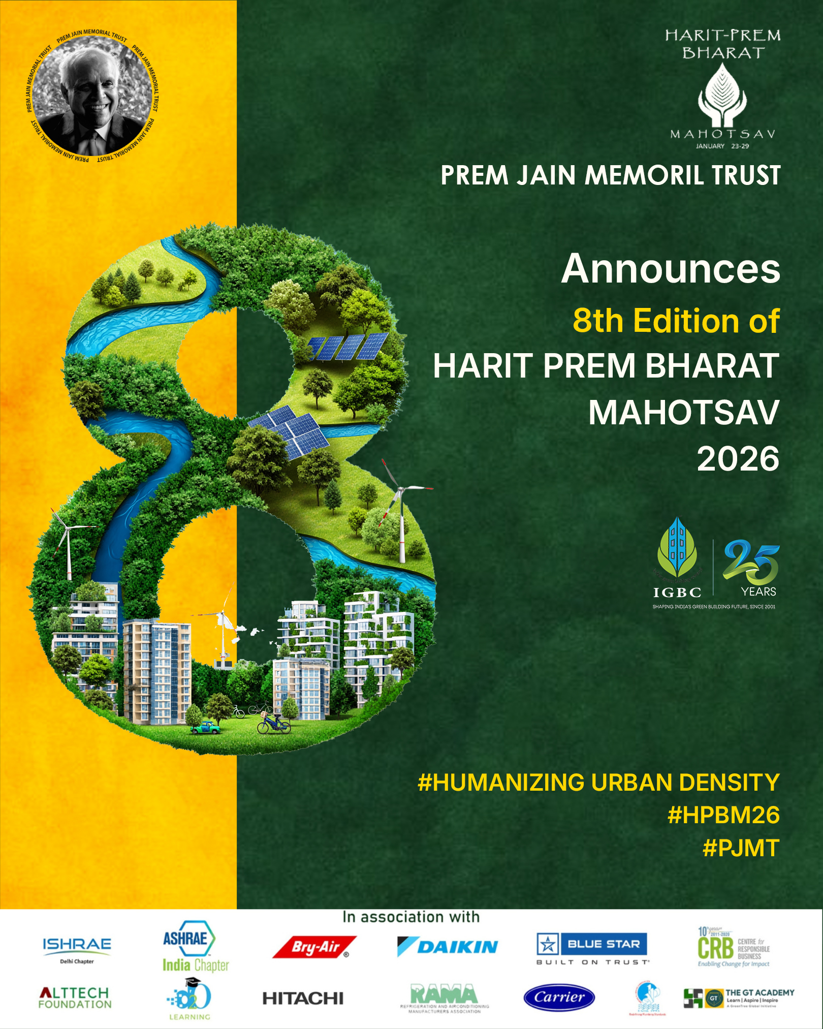 Prem Jain Memorial Address is organized annually during the Harit-Prem Bharat Mahotsav, in order to promote interface amongst sustainability champions and communities through interaction and network alliances and to achieve sustainability. The second edition of Prem Jain Memorial Address will be held on Monday, 27th January, 2020 at C.D. Deshmukh Auditorium, India International Centre, New Delhi with renowned speakers, who will speak to an audience of students, architects, engineers and young professionals.